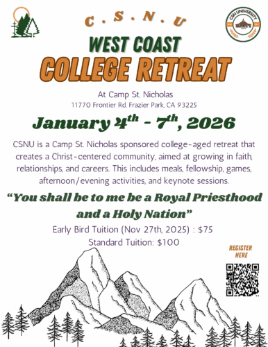 Camp St. Nicholas University (CSNU) is a college-aged winter retreat that encourages and empowers a Christ-centered community aiming to grow in faith, relationships, and careers. It is open to those entering, enrolled in, or recently graduating college (or those of equivalent age who are not attending college).
